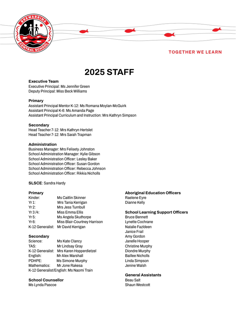 Our school team is committed to every student’s learning, wellbeing and sense of belonging. We work together to create a supportive and inclusive school where every child is set up for success.